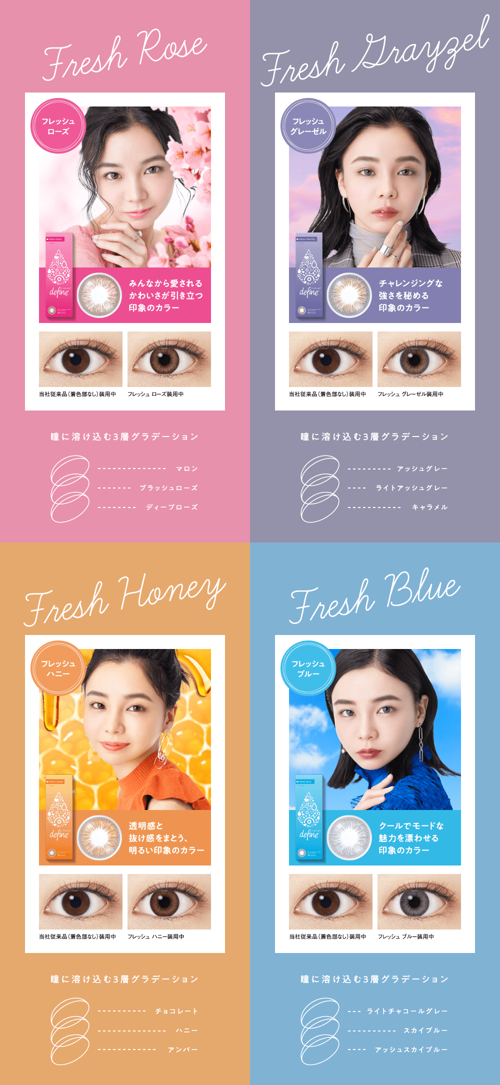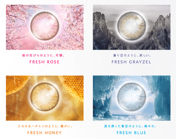 | 顏色 | Fresh Rose 玫瑰粉紅, Fresh Honey 蜜糖棕, Fresh Blue 魅惑藍, Fresh Grayzel 冷灰棕 |