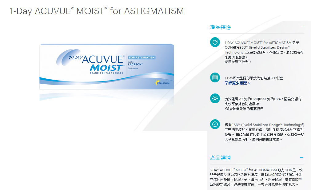 | 度數 | 近視度數:平光 至 近視600度(每25度一級) 散光:75度,125度,175度 線位:10°, 20°, 60°, 70°, 80°, 90°, 100°, 110°, 120°, 160°, 170°, 180° 散光:225度 線位:20°, 90°, 160°, 180° 近視度數:近視650度 至 近視900度(每50度一級) 散光:75度,125度,175度 線位:10°, 20°, 60°, 70°, 80°, 90°, 100°, 110°, 120°, 160°, 170°, 180° 散光:225度 線位: 20°, 90°, 160°, 180° 遠視度數:遠視25度 至 遠視400度(每25度一級) 散光:75度,125度,175度 線位:20°, 70°, 90°, 110°, 160°, 180° |