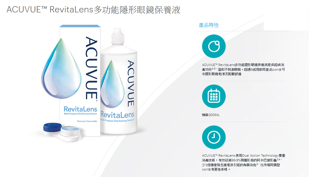 ACUVUE™ RevitaLens多功能隱形眼鏡保養液提供超卓消毒功效2-5,溫和不刺激眼睛。超過9成用家同意此con水可令隱形眼鏡乾淨及配戴舒適